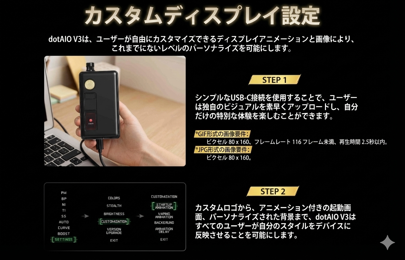 またディスプレイ画面JPG、GIF対応となり、好きな画像をインストールすることが出来ます。